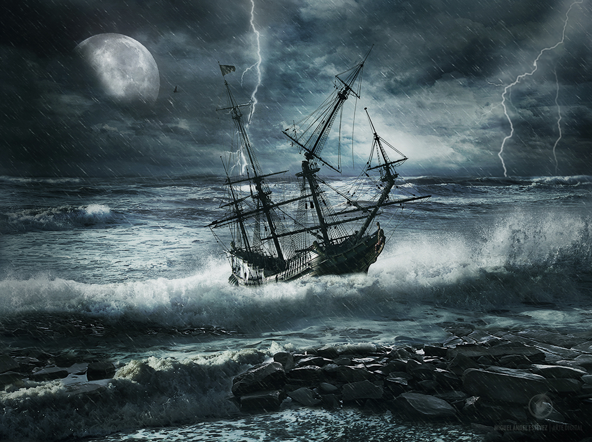 Ditengah samudera yang luas itu tiba-tiba menerpalah badah yang sangat dahsyat disertai tiupan angin disegala penjuru. Halilintar menyambar dimana-mana beserta topan mengerikan yang membentuk pusaran angin diatas langit dan semrawutnya keadaan air laut pada waktu itu.