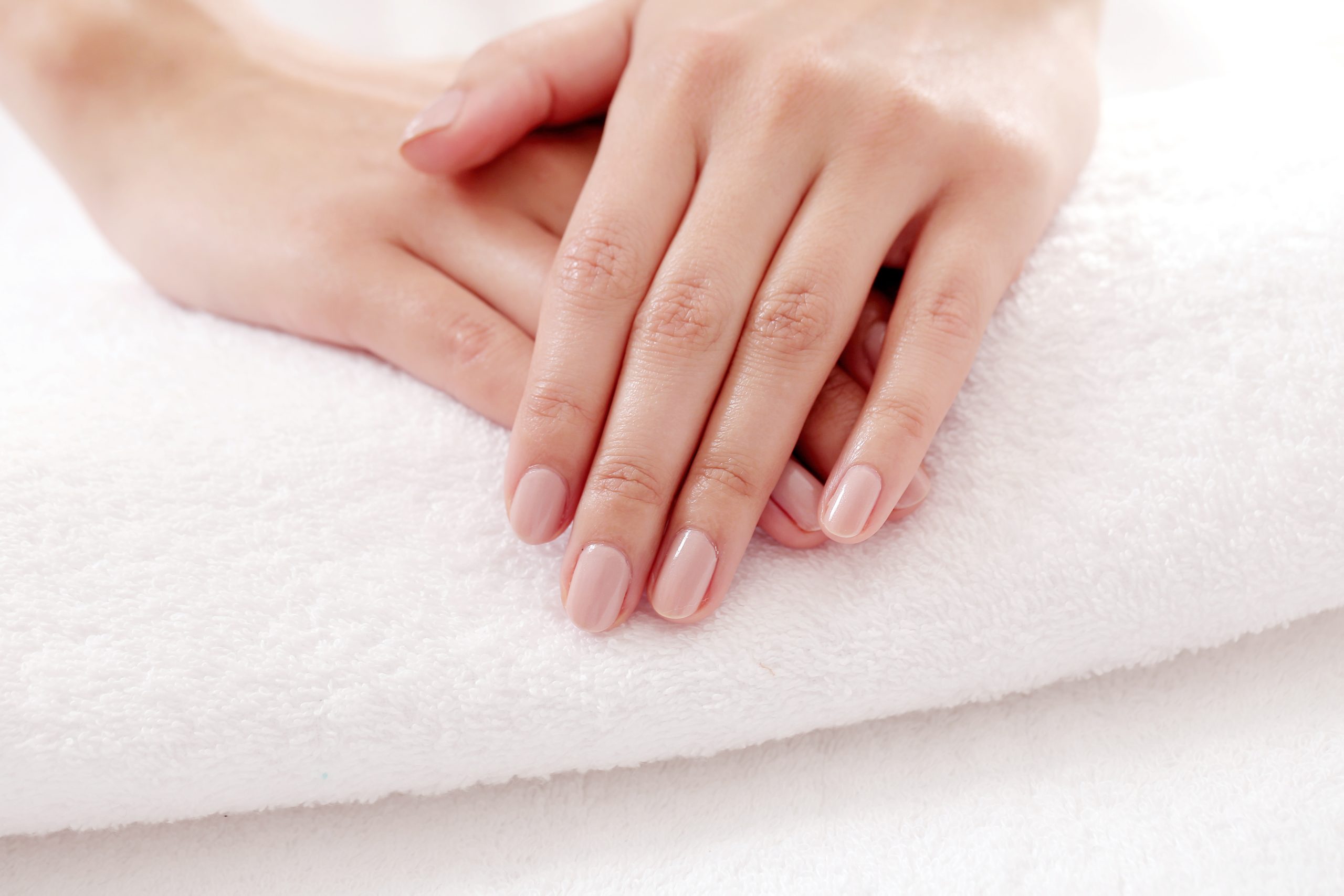 Skincare. Soft and clean hands on a white towel