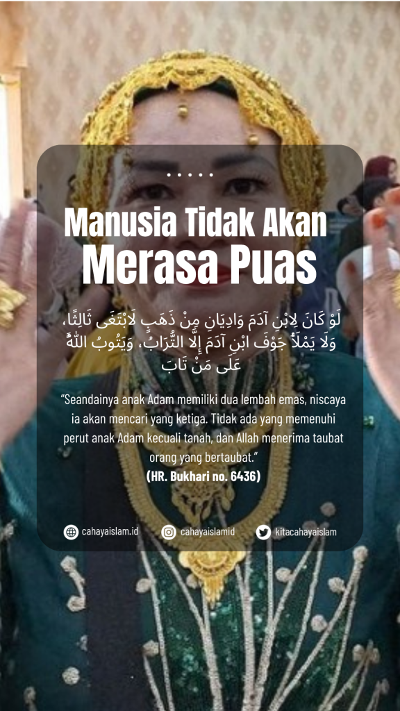 Hadis ini menggambarkan sifat manusia yang mudah tamak jika tidak dikendalikan. Keinginan yang terus bertambah dapat membuat seseorang tidak pernah merasa puas.